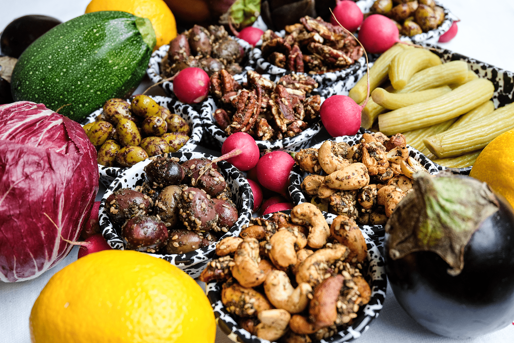 Check out our best of borrel selection: sweet & salty oven roasted nuts with zaatar & honey , crunchy salty sour pickles & sumac or zaatar infused olives.